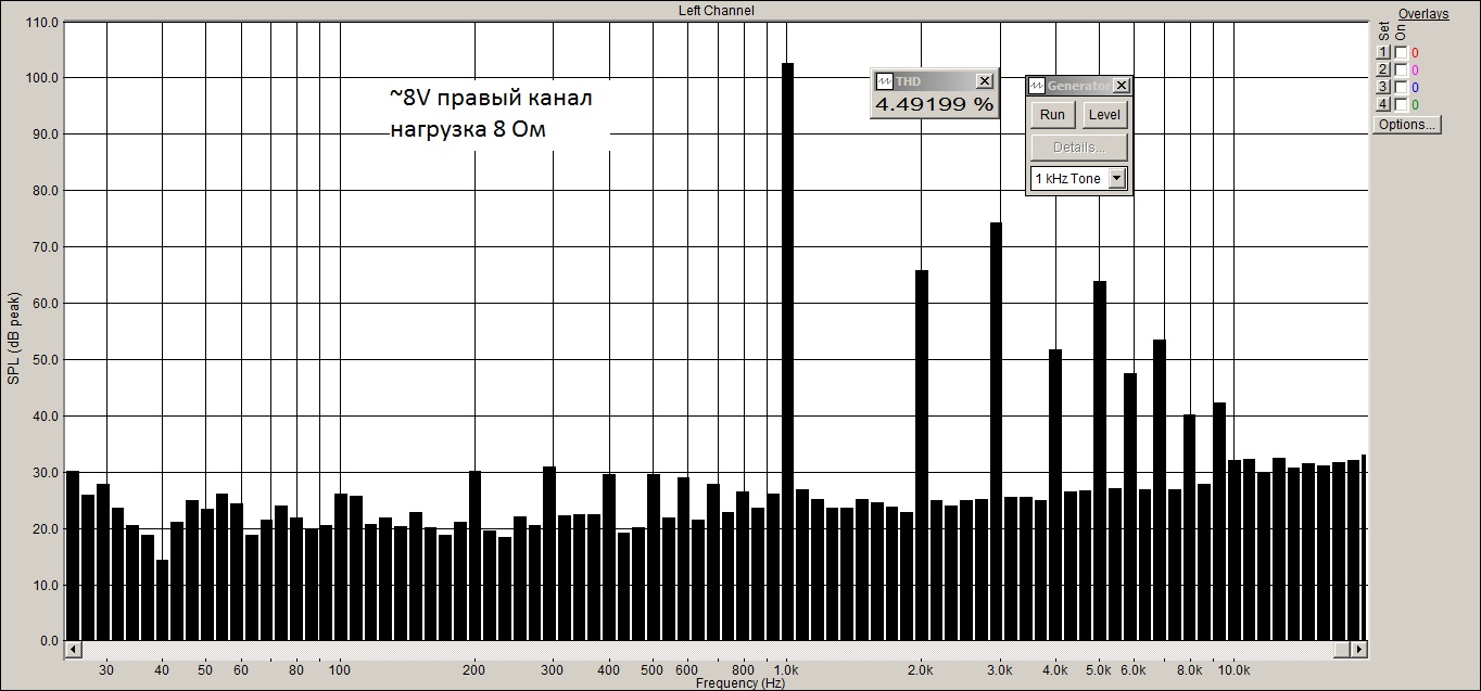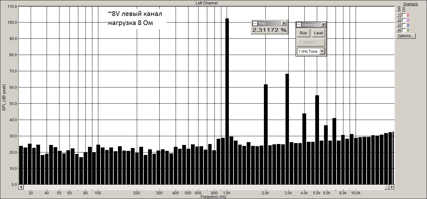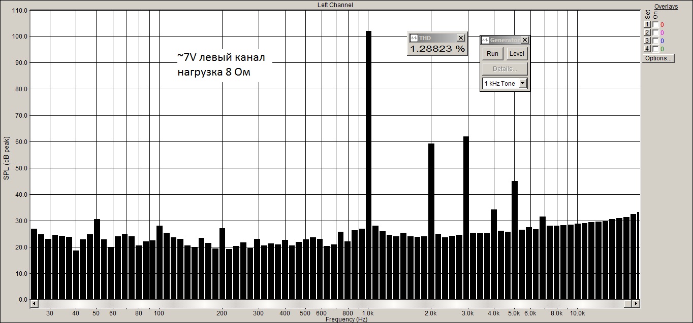 Заснял через Спектралаб спектр сигнала 1 кГц синусоиды. Почему-то один канал показал результаты хуже, чем другой.