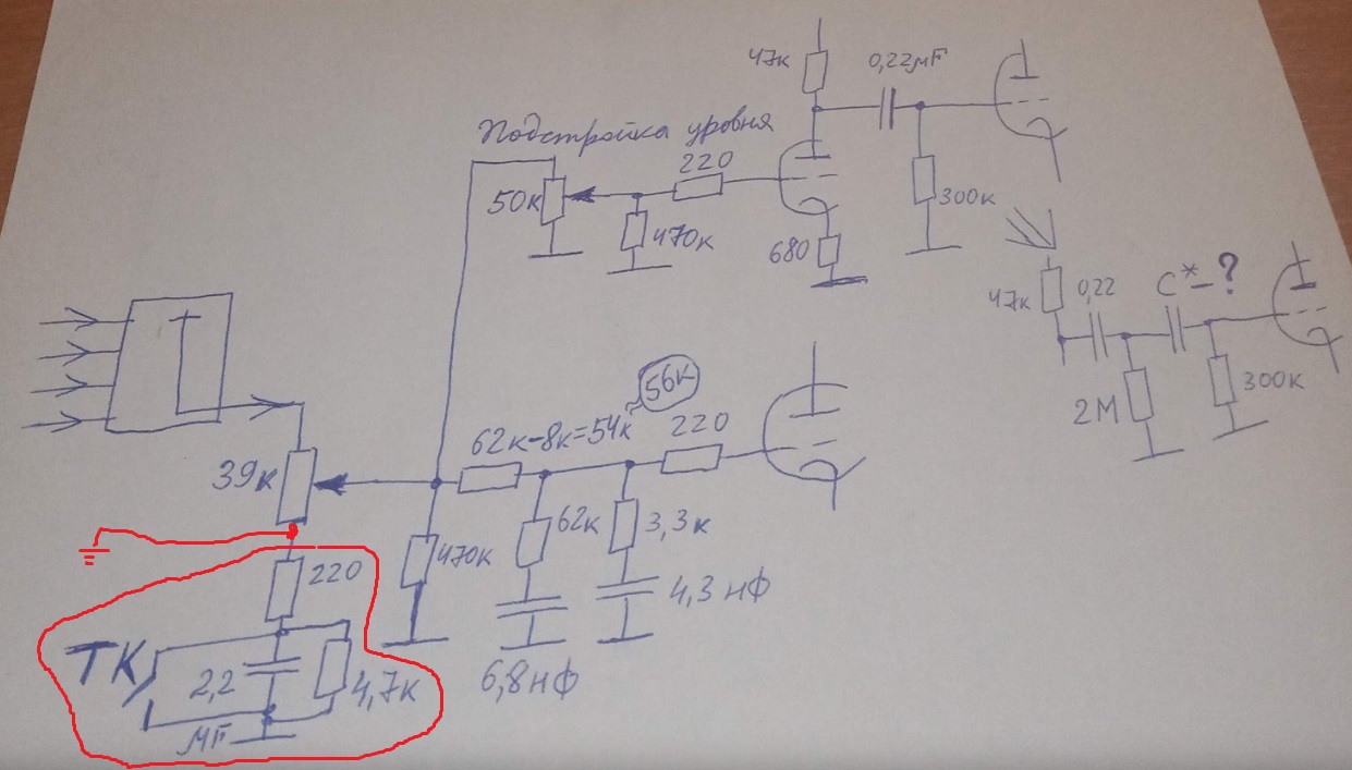 Если же ставить схему между каскадами ламповика, то выходное сопротивление будет для схемы первым резистором, К уже задан. Например, в аноде стоИт 33 кОм. Наш К=33/2=16,5 раз. Хотя, неправильно. Нельзя ламповый каскад грузить сильно меньшим сопротивлением, КНИ на СЧ вырастет. Лучше учесть выходное сопротивление предыдущего каскада при расчете К. Тогда первый резистор остаётся 65 кОм (62 кОм), сумма 95 кОм, К=95/2=42,5 раза, например, нагрузка на СЧ падает меньше. чем на 30%. Или первый резистор 33 кОм, тогда К=(33+33)/2=33 раза, как раньше, на СЧ нагрузка лампы падает меньше, чем на 45%.