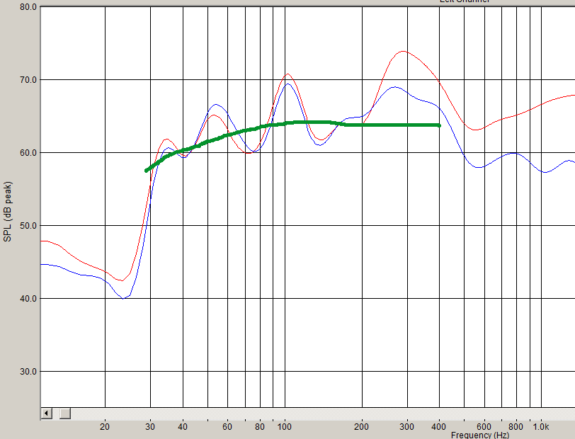 щит с 1 м с ЗЯ в углу, тоже с 1 м. Я провёл зелёные линии - средний уровень обоих динамиков. Красным - влияние комнаты на АЧХ или, по-нашему, комнатные резонансы.