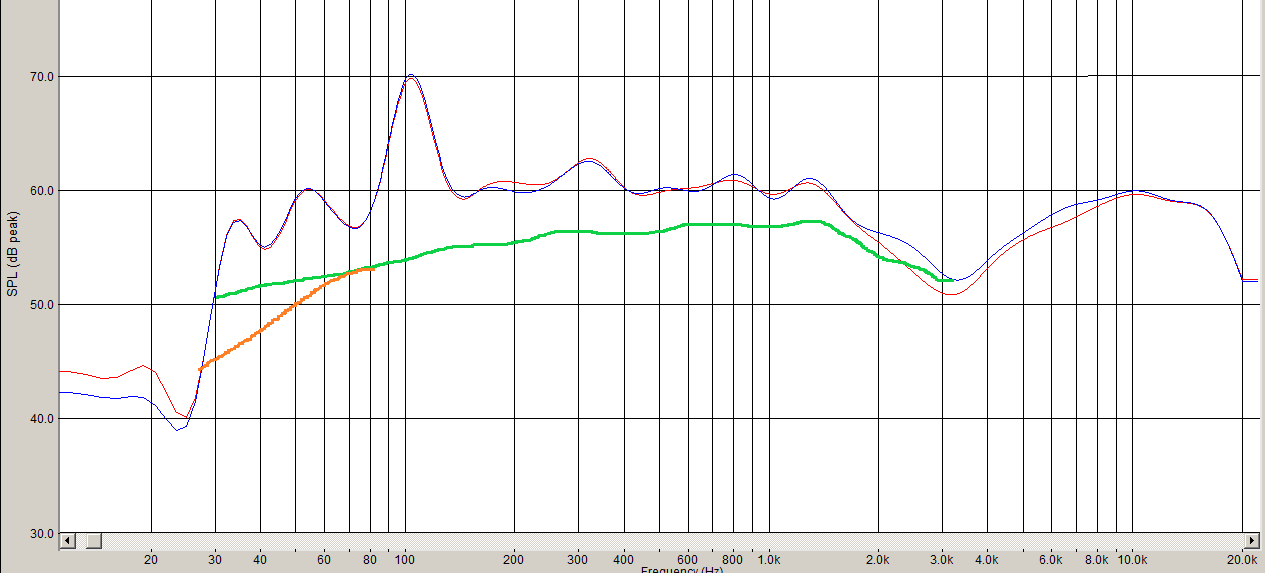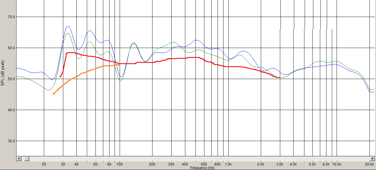 Однако, внимательное рассмотрение показывает, что имеем перебор всей зоны средних частот: с двух метров АЧХ должна иметь плавный скат в сторону ВЧ (у нас - неограниченное временнОе окно, все-все комнатные отражения, а с ростом частоты коэффициент отражения падает, и мощность диффузных переотражений снижается), а у нас от 200 до 1,5 кГц - степь (не видел такой с двух метров, да со всеми отражениями комнаты впридачу!), а склон - в сторону НЧ, 100-герцовый пик не в счёт, в других точках его нет, а есть другие. Реальная полоса от 32 Гц, со щитом, это же надо. Если убрать реверберацию комнаты, то, у прямой волны (которая - без отражений, и отвечает за атаку звука) будет где-то так (зелёная - в предположении малого влияния стоячих волн, оранжевая - более реалистичный прогноз):