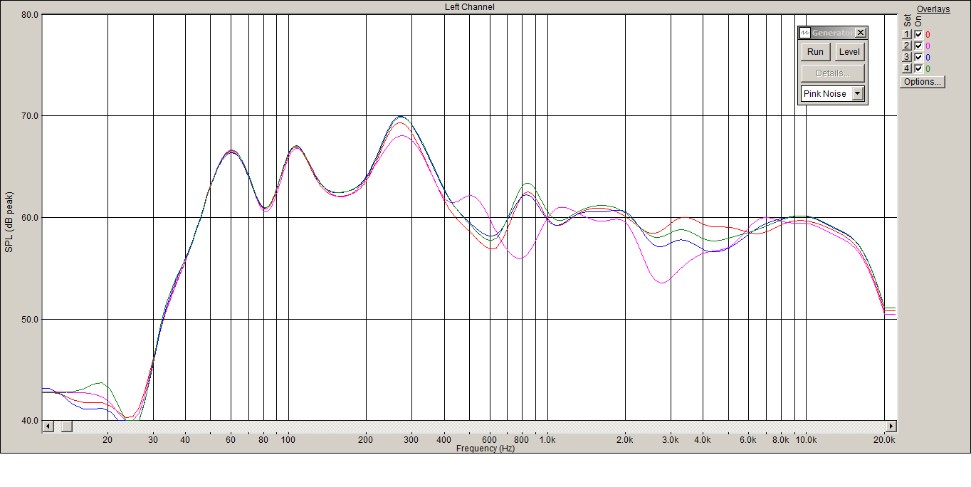 Сделал замеры. Микрофон 2 м от динамиков, примерно по оси, на высоте 1,5 м от пола. Результаты получил такие: