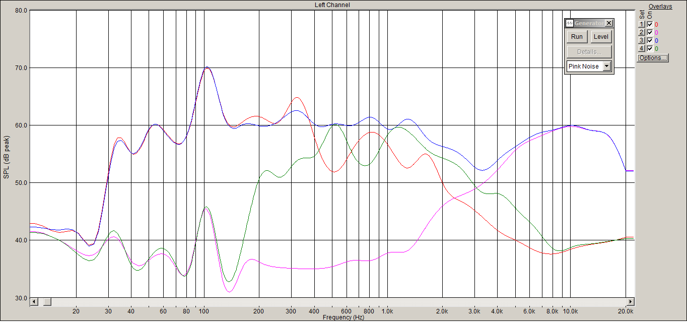 Честно говоря - довольно трудно найти в комнате точку, где не выпячивается пик 100 Гц. Меня это смущает. Ещё смущает - что пик 100 Гц также присутствует при замерах СЧ и ВЧ динамиков отдельно.