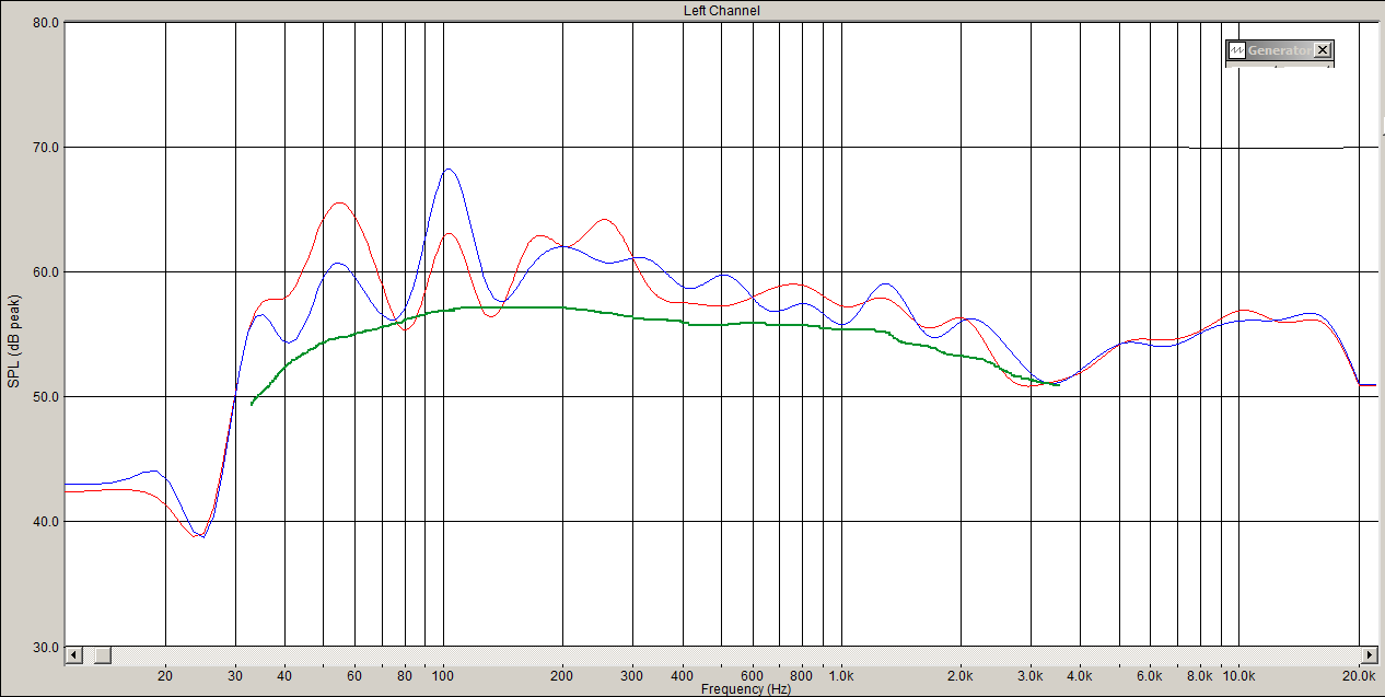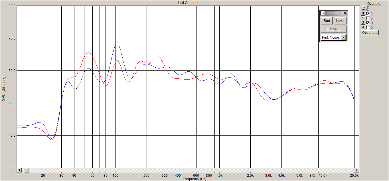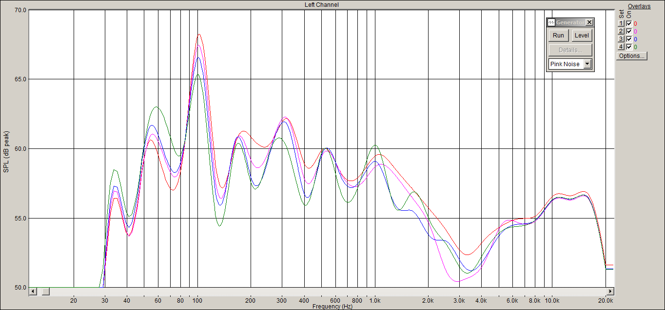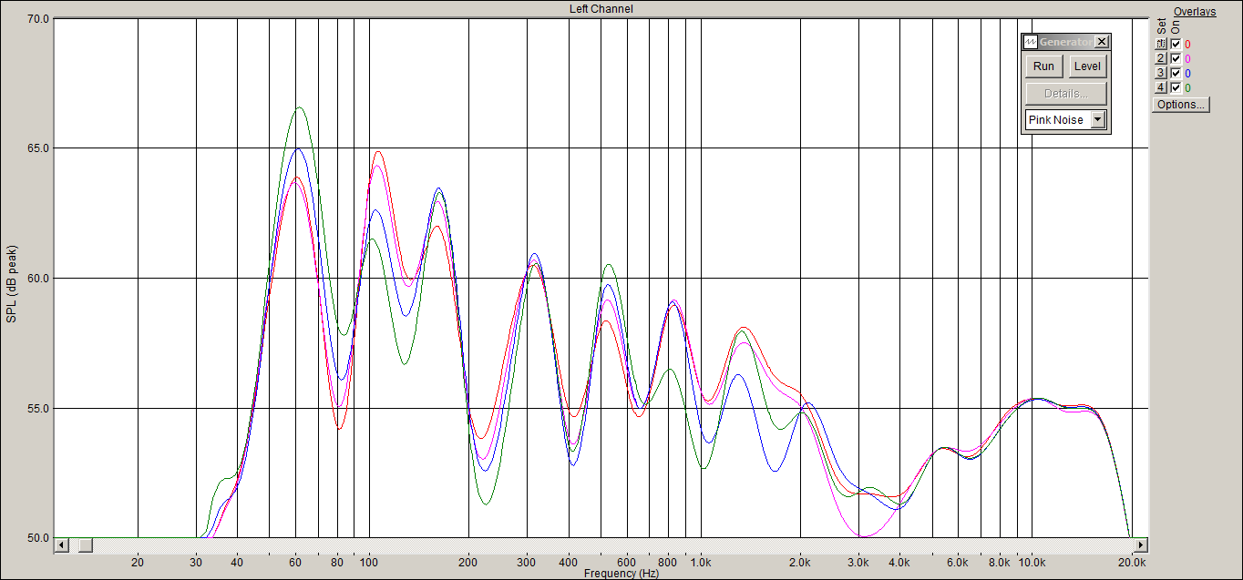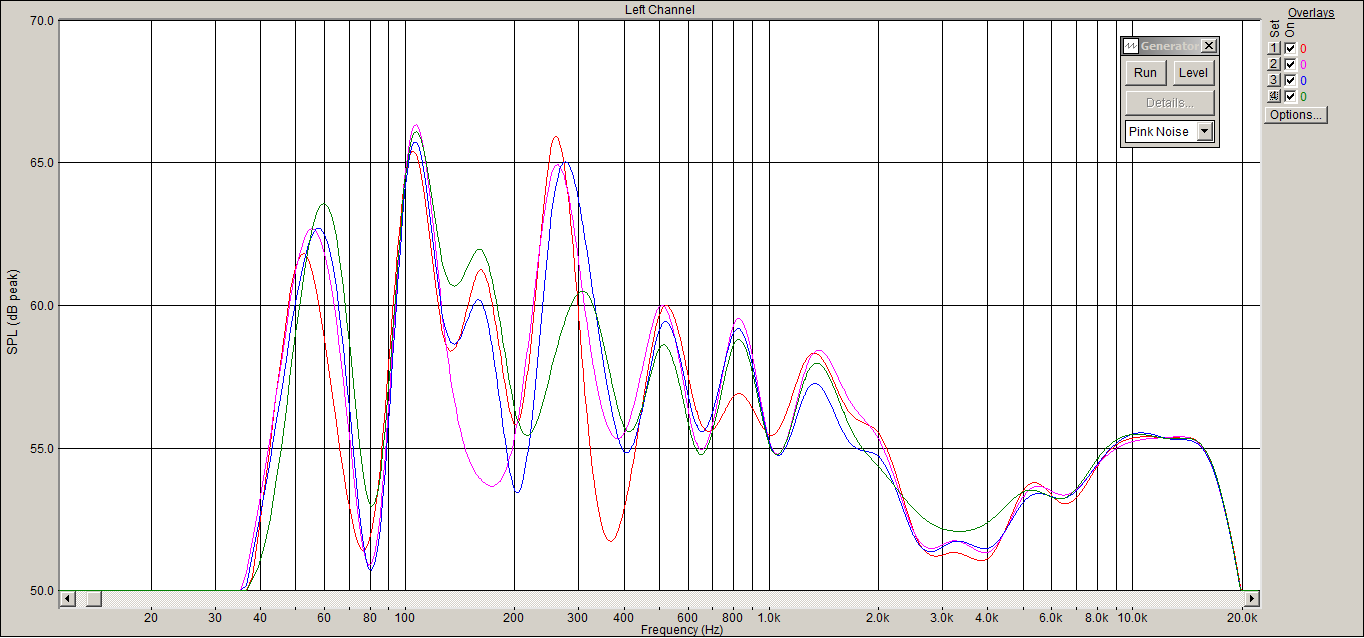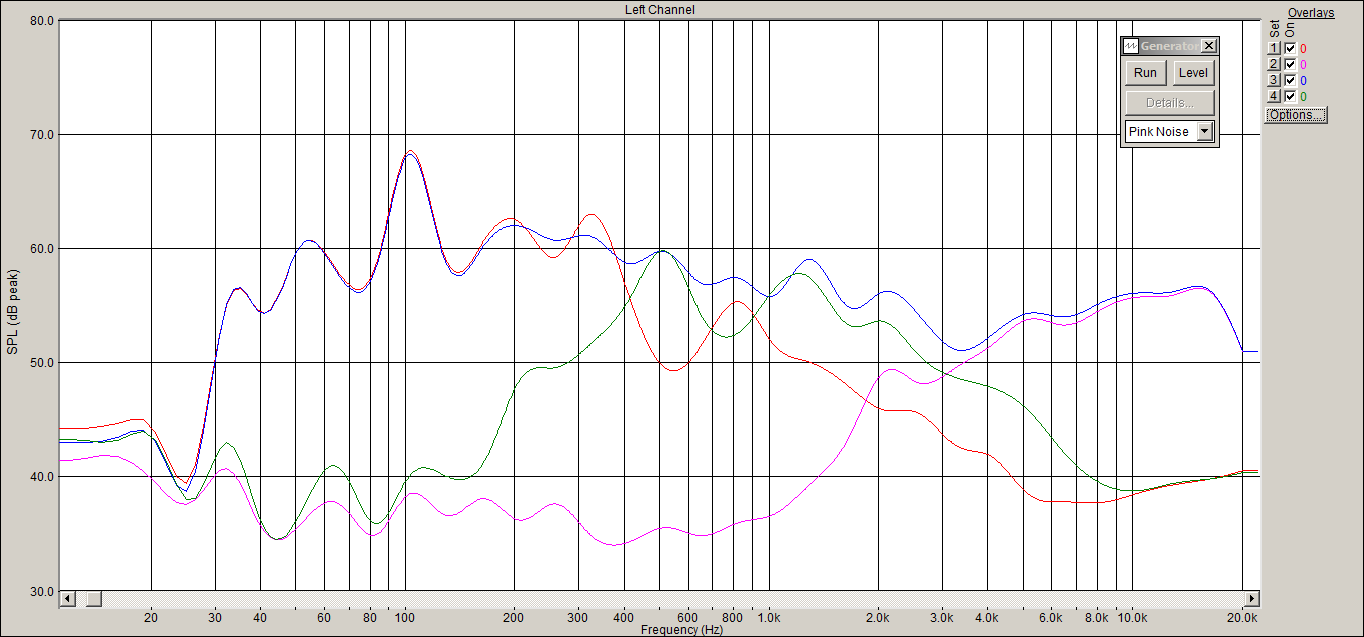 Сделал замеры. Микрофон - 2 м по оси динамиков, 1,5 м от пола. При замере пополосно - вместо НЧ и СЧ динамиков - подпаивал указанные резисторы. Холодильник отключил. Результаты: