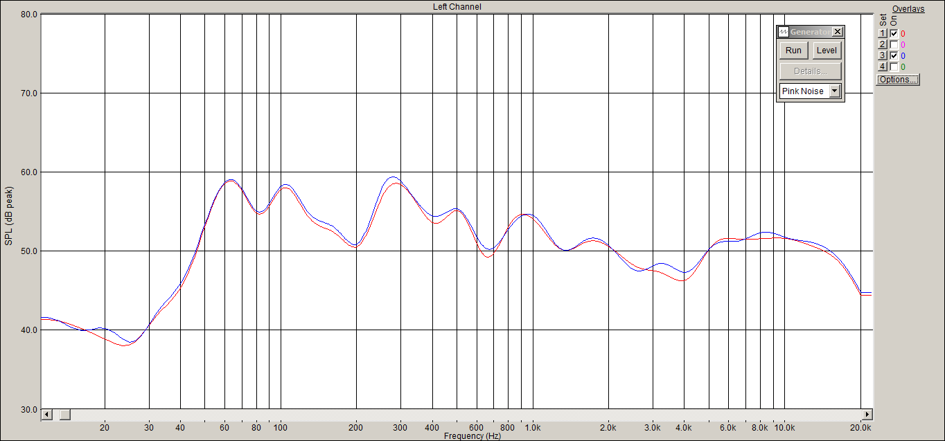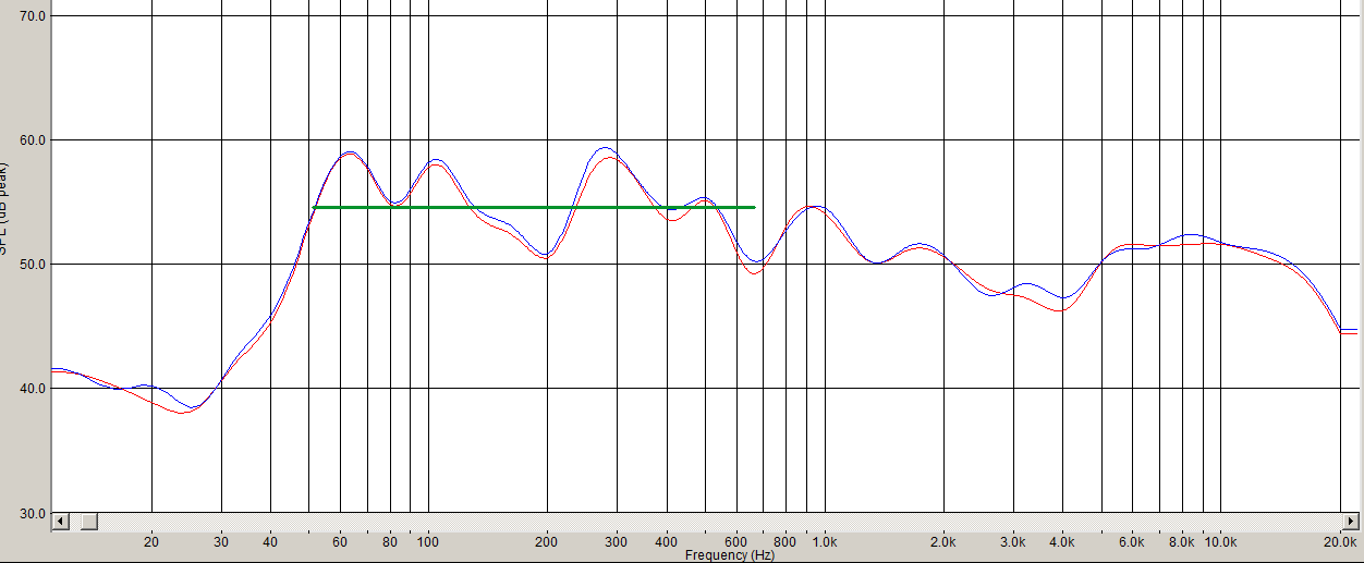 синяя линия - микрофон на 2 м по горизонтали от басовика и на высоте 1,5 м от пола. Красная линия - микрофон на 1 м по оси басовика