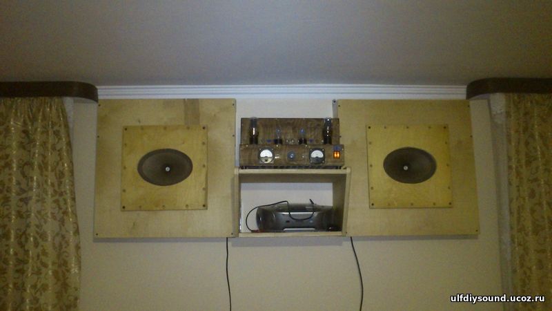 Угол под потолком, в нем треугольная призма , в ней пара динамиков 5ГД-1 в просторном объеме , бас протягивается комнатой плюс корректор Линквитца