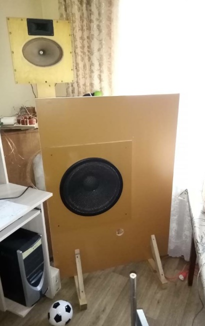 Ранее - уже была опробована подобная схема, но СЧ/ВЧ щиток был разнесён с басовиком примерно на 1 м. И расположен СЧ/ВЧ щиток был наверху. Так вот, когда СЧ/ВЧ щиток был на уровне ушей по высоте - тот вариант по звучанию был лучше, чем сейчас, когда СЧ и ВЧ внизу, в районе НЧ.