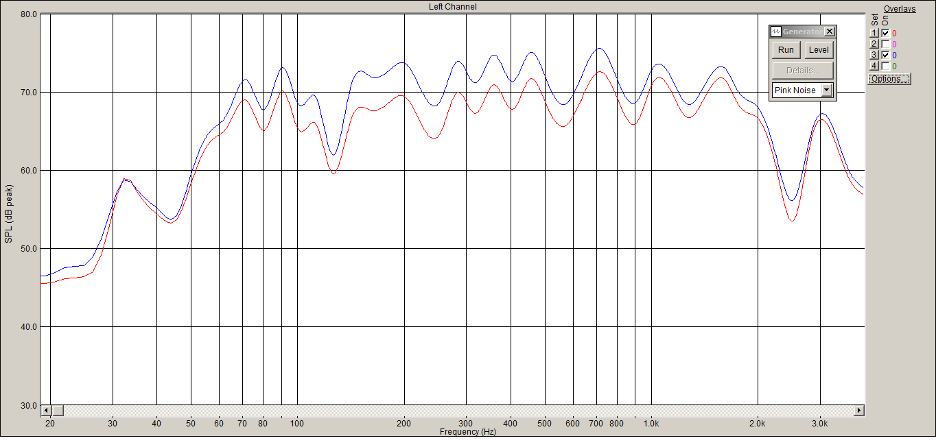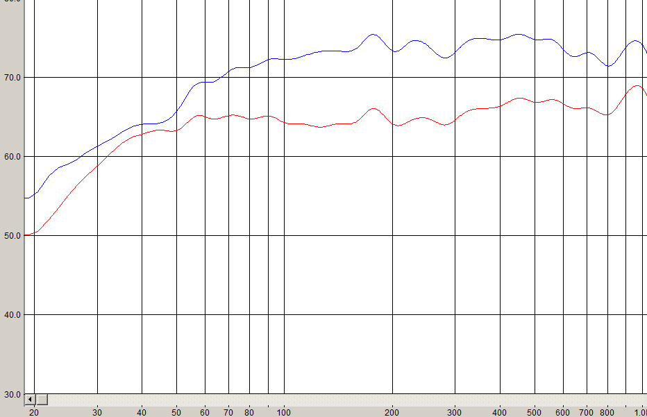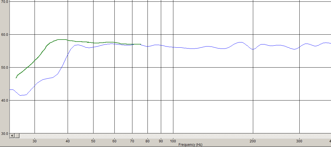 Жёстко хата набросала кривулин на мидбасе, ну да ничего. Вторая АС разбавит и усреднит и НЧ, и мидбас.При выставленном чуть выше эквалайзером - полка почти от 40 Гц в упор динамику - заснял пару АЧХ (подключал и отключал SE УНЧ с СЧ/ВЧ.