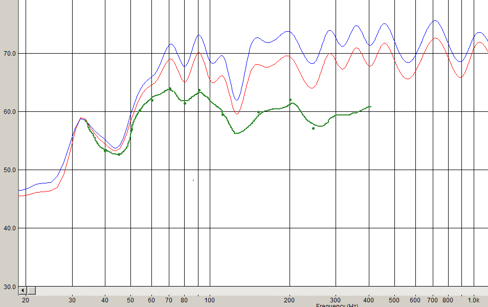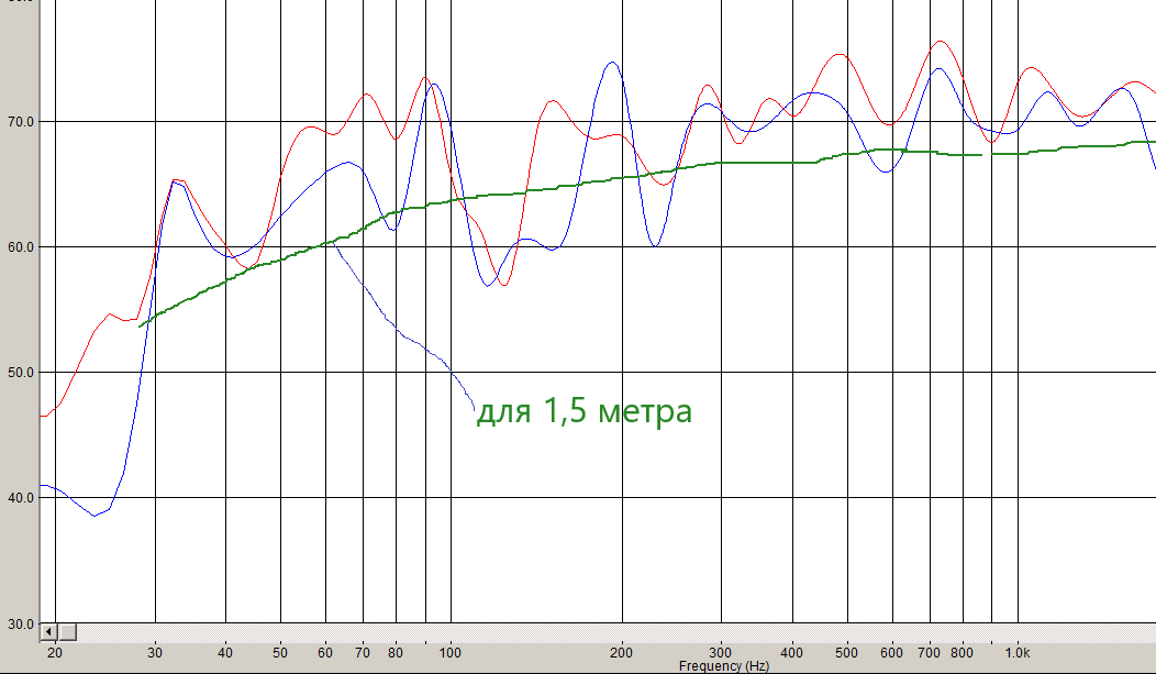 Вот примерно уровень прямой волны с 1,5 метра (зелёная кривая). То же самое, что вблизи динамика, но без 15 Ом (синяя кривая на нижнем рисунке)!