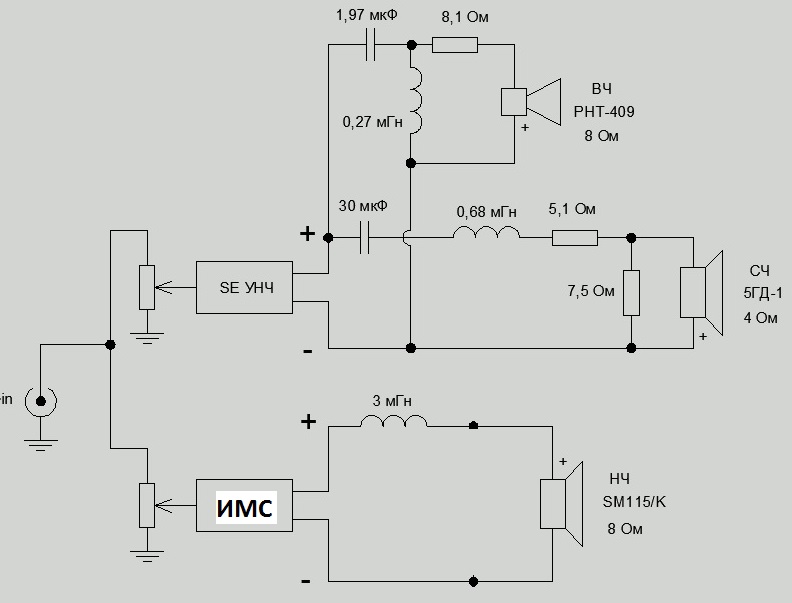 ФНЧ по входу ИМС... Номиналы обкатаны. Никаких катух.Подвалить полку вправо катухой на пару мГн и бас в норме.