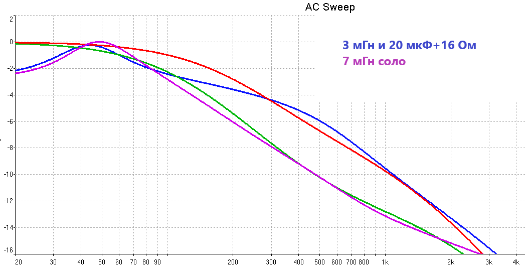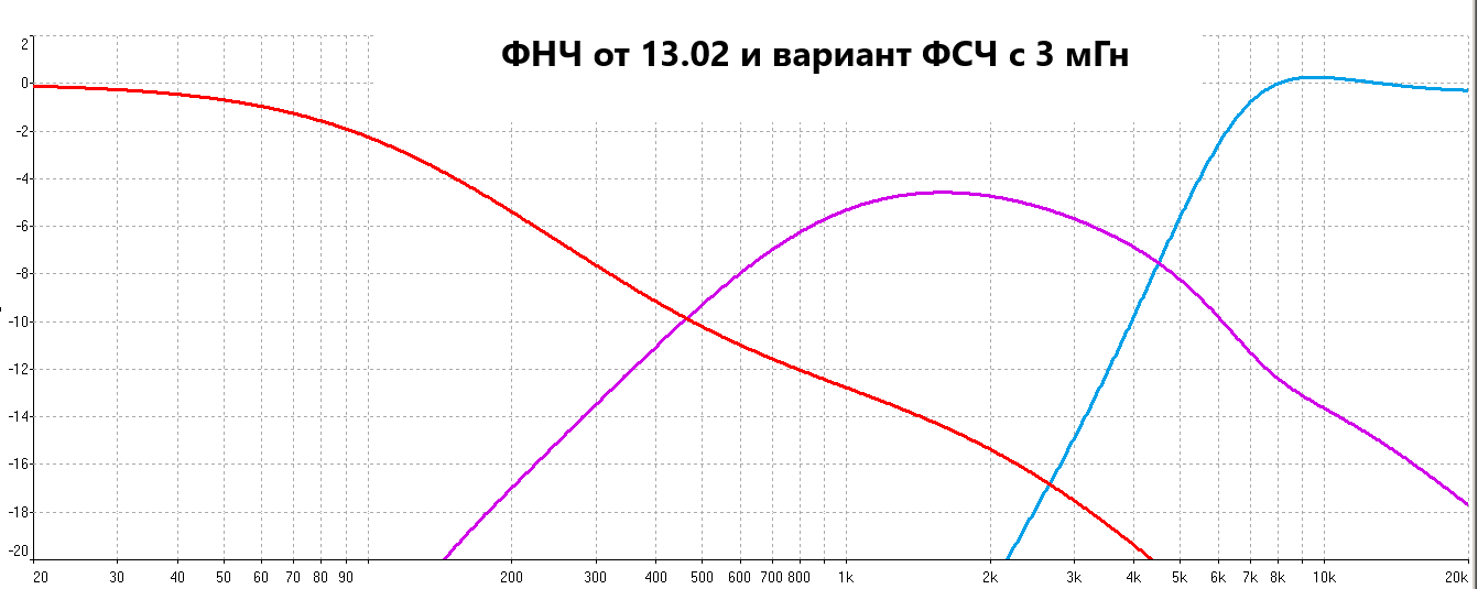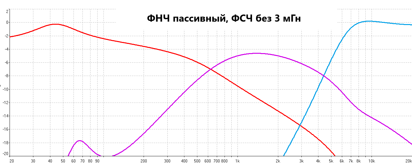 Сравнение плАтки-ФНЧ с пассивными фильтрами при работе от источника 2 Ома, СЧ/ВЧ подключены.