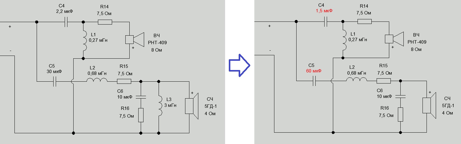 В СЧ полосе - на динамик прошли частоты его механического резонанса. Сейчас СЧ дин стоИт на большом щите, и его работа на 70 Гц вполне слышнА, ФВЧ в составе одного 60 мкФ не справляется с фильтрацией на частоте резонанса, он басИт! Спрашивается: нафига? Чтобы огрести кучу ИМИ и получить гул на одной частоте 70 Гц, механическая добротность 5 единиц (ладно, сзади подушка синтепона, 3 единицы)? В параллель СЧ нету даже резистора, чтобы сбить пик 70 Гц от СЧ динамика.