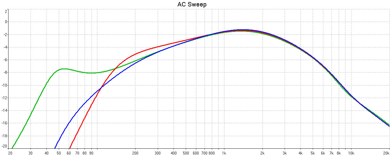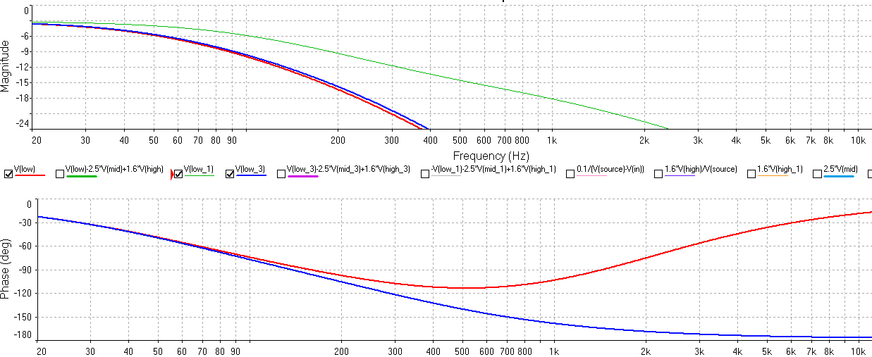 Зелёная кривая - нынешний ФНЧ. Синяя и красная - схемы на рисунке, отличаются заворотом фазы на СЧ: у красной максимум -110°, может пригодиться. Поднимаем уровень на 6дБ и получаем частоту раздела что-то... 350 Гц? Всё равно высоко, но не 900. Пробуем.
