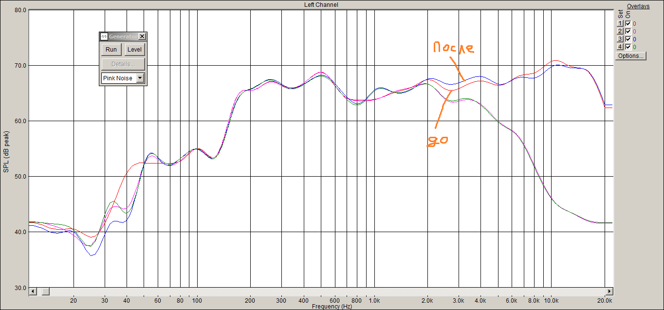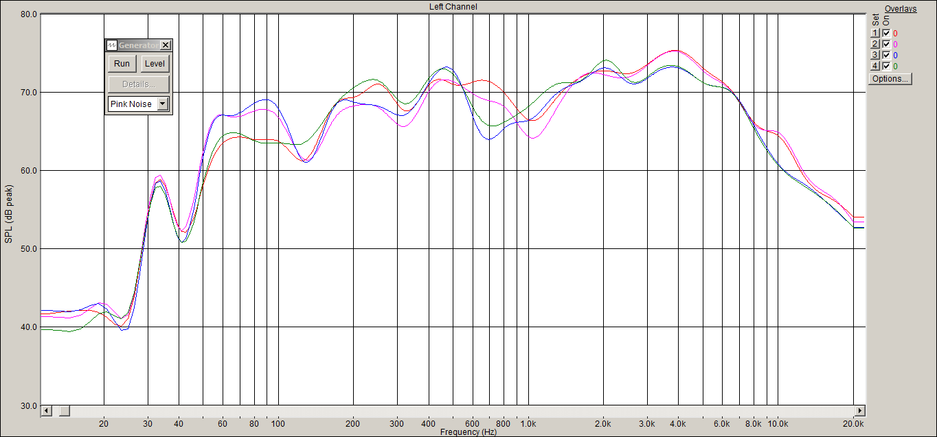 красная и малиновая, а также синяя и зелёная - один и тот же динамик (это видно по АЧХ выше 4 кГц). Поменяно расположение справа/слева