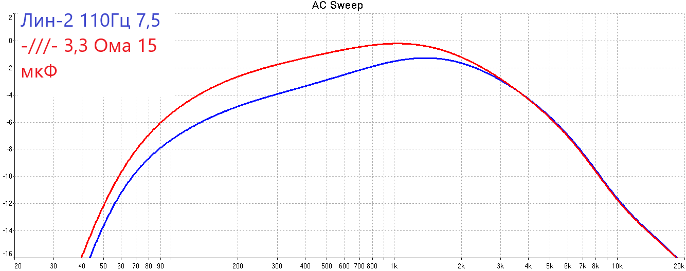 2 - изменение номиналов этих деталей - дало подъём в области 200 Гц для СЧ динамика. Симулятор Николая отображал это вот так: