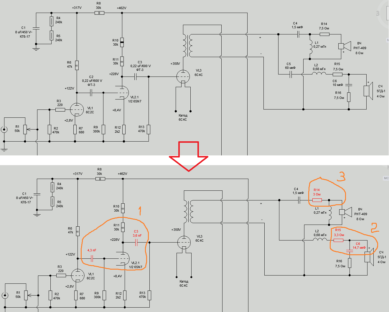 1 - вместо конденсатора 60 мкФ в пассивном фильтре перед СЧ динамиком - были установлены малые межкаскадные конденсаторы в схеме лампового усилителя (один канал). На слух - я разницу этого этапа не уловил (между тем что было и что стало). Микрофон - фиксирует примерно одинаковый ход АЧХ для этого изменения (то есть, что было "до" и что стало "после").