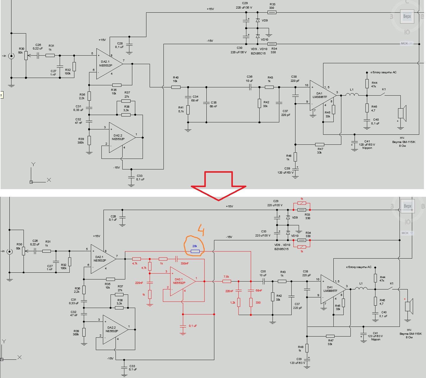 дело в том, что нижняя полка - придаёт голосу некие положительные свойства. И без этого - не получался голос таким, как был в летнем варианте. На слух я подобрал оптимальное положение переменника и установил постоянный резистор 20 кОм.