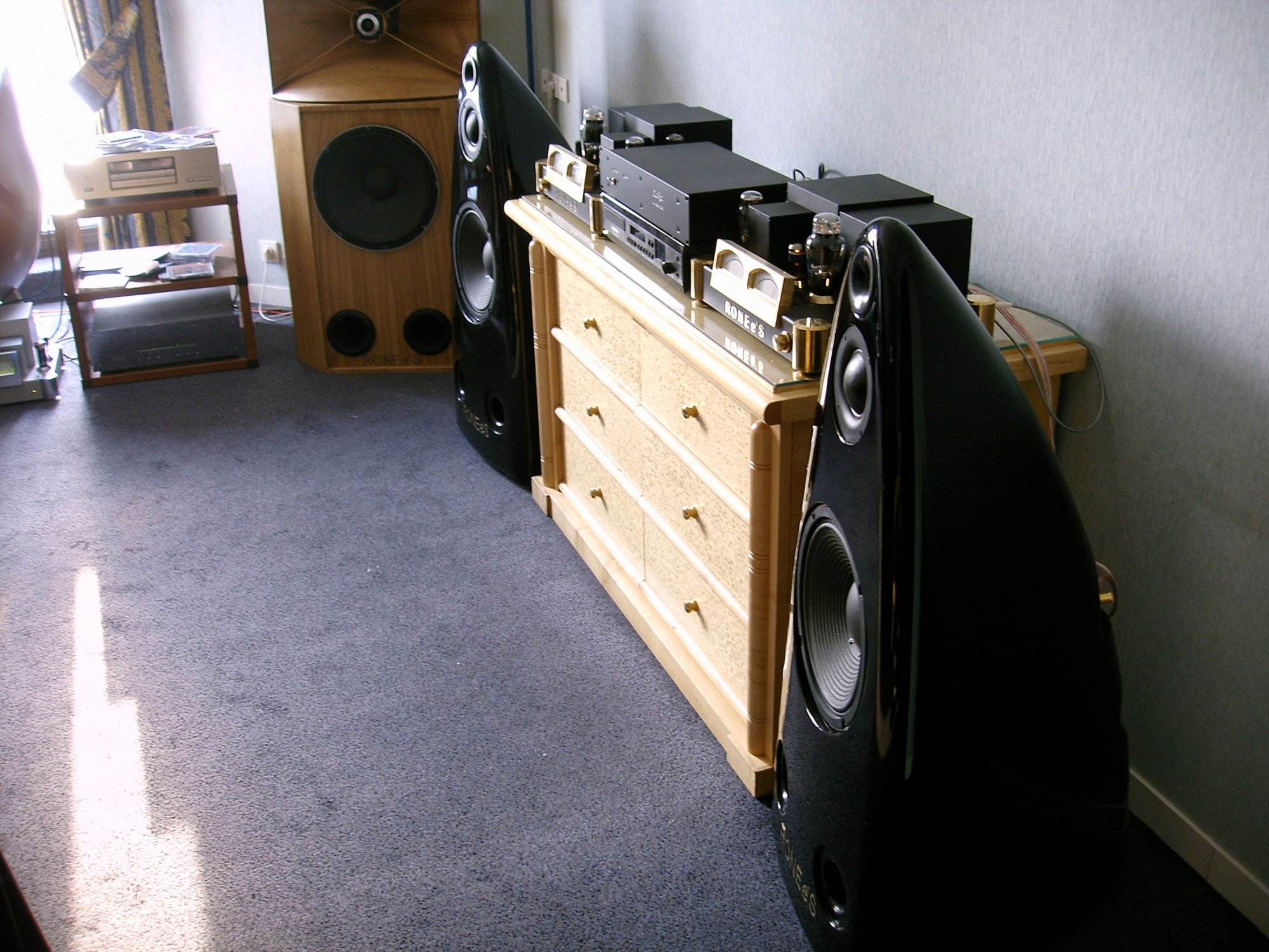 Мои имеющиеся 40 см динамики - это размятые до Fs = 37 Гц RFT L3702. Они работают в ОЯ объемом 115 л - резонансная частота в ОЯ снижается - от 30 Гц от усилителя на 6Ж4 - ГУ50 с Rвых = 20 Ом. Мощность 8 Вт. Это усилитель НЧ полосы двухполосного усилителя. На СЧ-ВЧ работал усилитель на 2А3. После переезда в новую квартиру появилось желание упростить усилитель - сделать его однополосным, компактным и, по возможности, легким. Мои РФТ для однополосной системы не пригодны. Поэтому ищу динамики для обычных трехполосных АС работающих с однополосным ламповым усилителем мощностью 4 Вт.