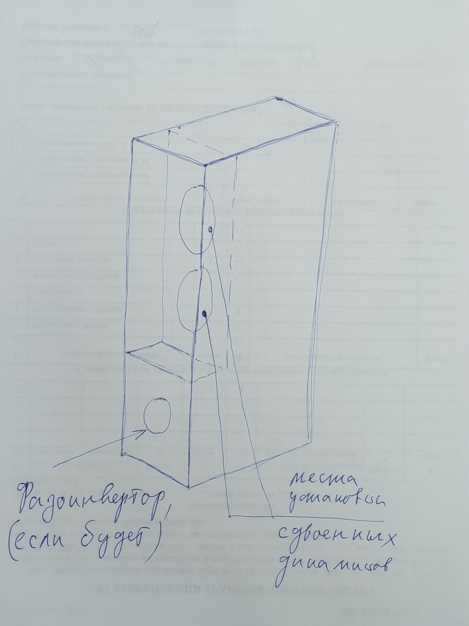 Чистый объём секции НЧ - 65-70 литров, грязный (с фильтрами, динамиками и перегородкой) - около 100 литров. Пары динамиков располагались справа и слева от вертикальной оси диффузорами друг к другу на фронтальной панели под углом 60 градусов к горизонтальной плоскости, между ними - вертикально 3ГД-42 в отдельном ящике - 6 литров. Ширина АС навскидку 80 см, глубина 40 см, высота 32-35 см. Но надо понимать, что это ни разу не прямоугольный ящик, форма сложная. ФИ - щель по центру между НЧ-блоками, настроен на 30-35 гц. Параметры НЧ-динамиков по памяти - добротность 0,45, резонанс 32-35, экв. объём - 50 литров. Частота раздела НЧ и СЧ-ВЧ секции была примерно 400 гц, полосы были активные, каждая от своего усилителя, СЧ-ВЧ полоса пущена через эквалайзер для линеаризации АЧХ.