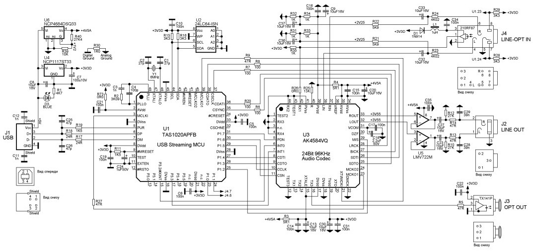 Вот, нашёл на просторах интернета схемку, вроде бы кто-то срисовал её с платы M-Audio Transit: