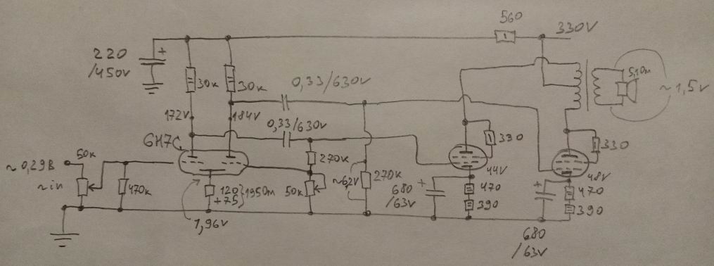 Померил переменные напряжения (эфф.). На входе - было 0,29В, на сетке выходной лампы 6,2В. Таким образом, реальное усиление напряжения на первом каскаде составило 6,2/0,29=21 раз. На выходных клеммах при этом (у меня там резистор 5,1 Ом был подключен), напряжение составило 1,5В. Эх.., никак не хватит усиления на первом каскаде, чтобы раскачать выходные лампы до ограничения. Но мне пока что - главное послушать. Завтра надеюсь.