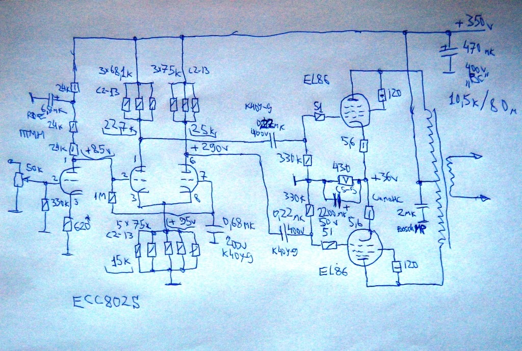По Вашей схеме не понял я - смещение у EL86 аж 36В. Питание аж 350В. Что за режим такой и почему? Для уменьшения тока через лампу, или есть изюмина в звучании?