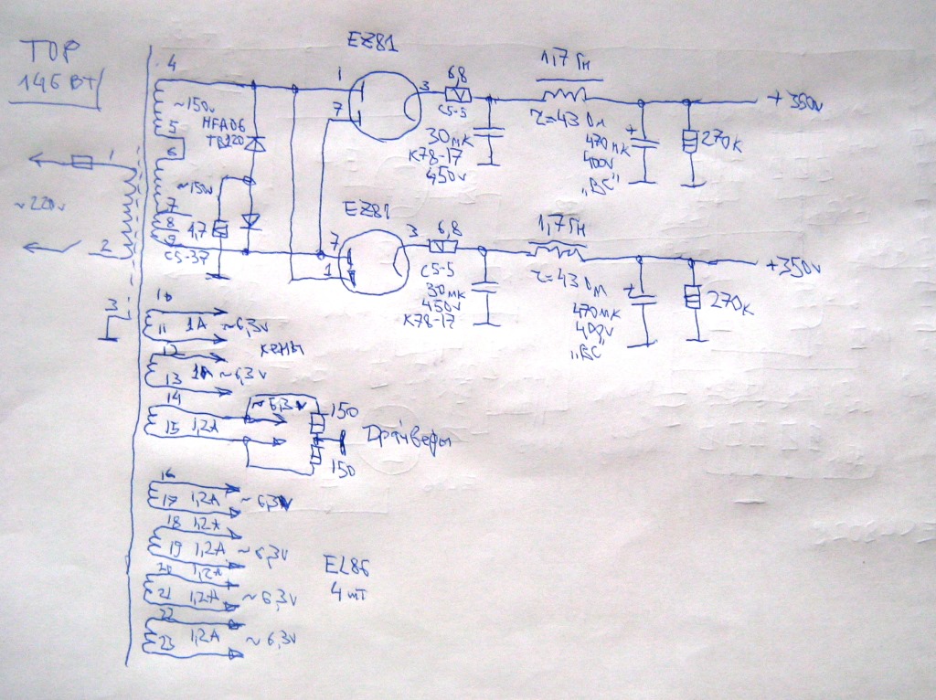 Это относится к левой половине входной лампы и обеим выходным по схеме выше?Пётр, не ЗАБЫВАЙТЕ про резисторы в сетках 51-470 ом! 6п14п запросто загенерит, да и 6н23п может. Возмите за правило, всегда ставлю и всё.