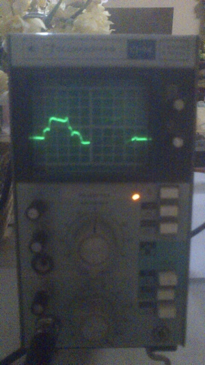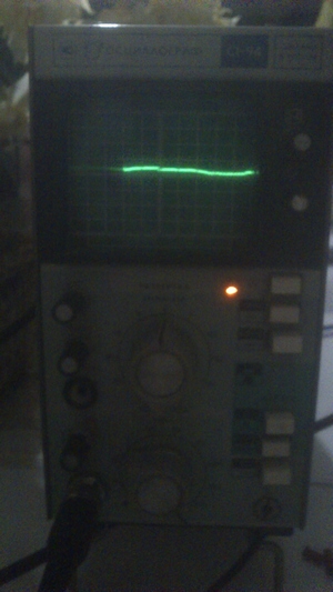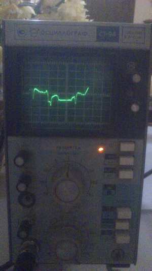 Если кому интересно, так выглядела осциллограмма (на сетке второго каскада 6Н8С) в положении минимума регулятора громкости: