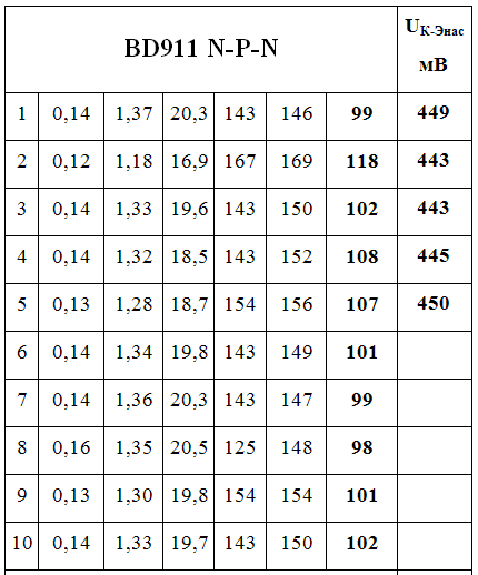 У меня десяток BD911 и десяток BD912, уверен, что с Али. Измерил половину, ниже результат. Напоминаю, ток коллектора 4 А.