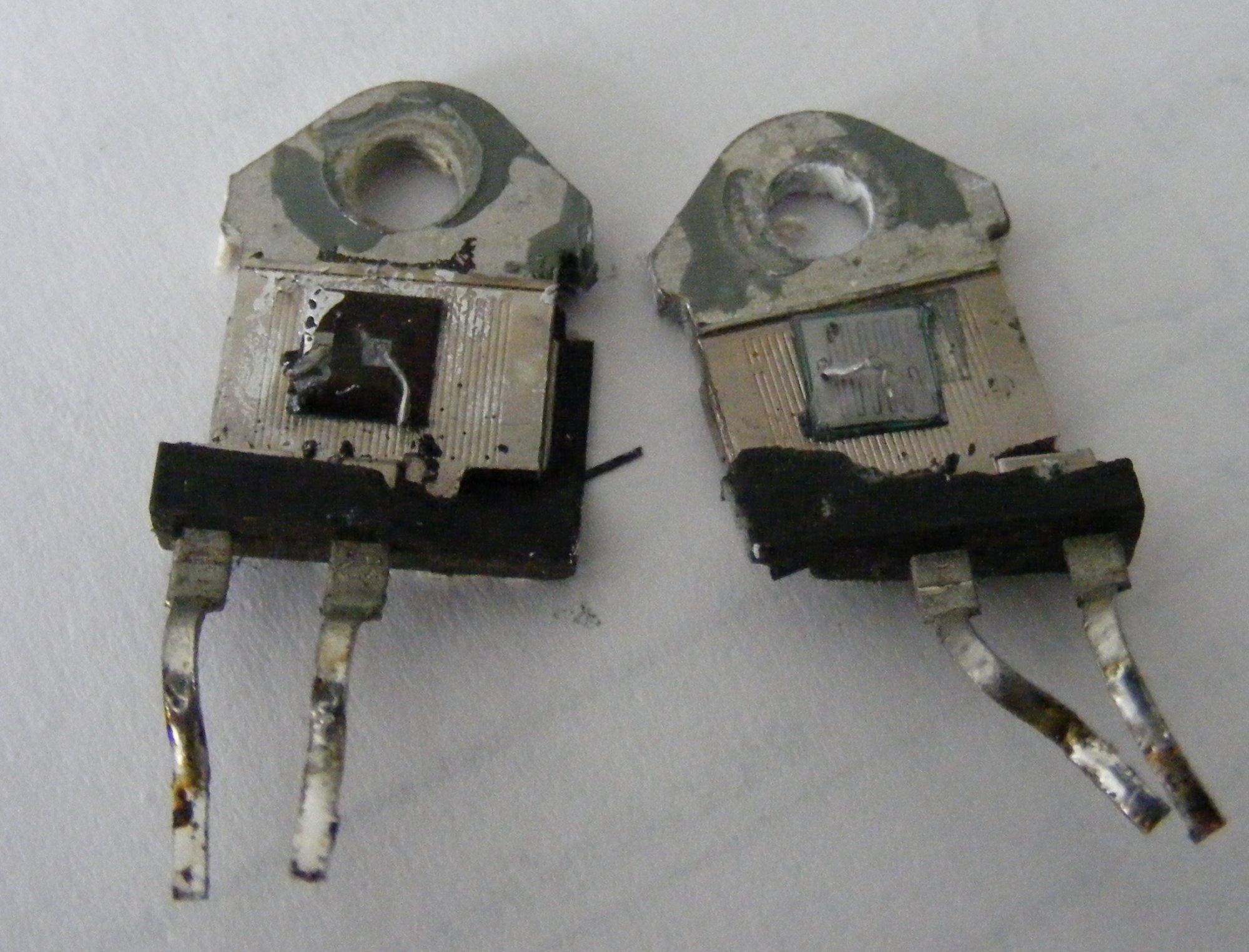 Но проблема в том, что и "восстановленные с разборки" 2SA1302 купленные на Али тоже укладывались в норму по datasheet - отличное ровное усиление, низкое напряжение насыщения. Но когда я поставил их в блок питания на место регулирующего транзистора, две штуки мгновенно по очереди сгорели. Вскрытие при помощи молотка и наковальни показало истину - кристалл 2 мм квадрат на стальной пластине (не непосредственно на медной).