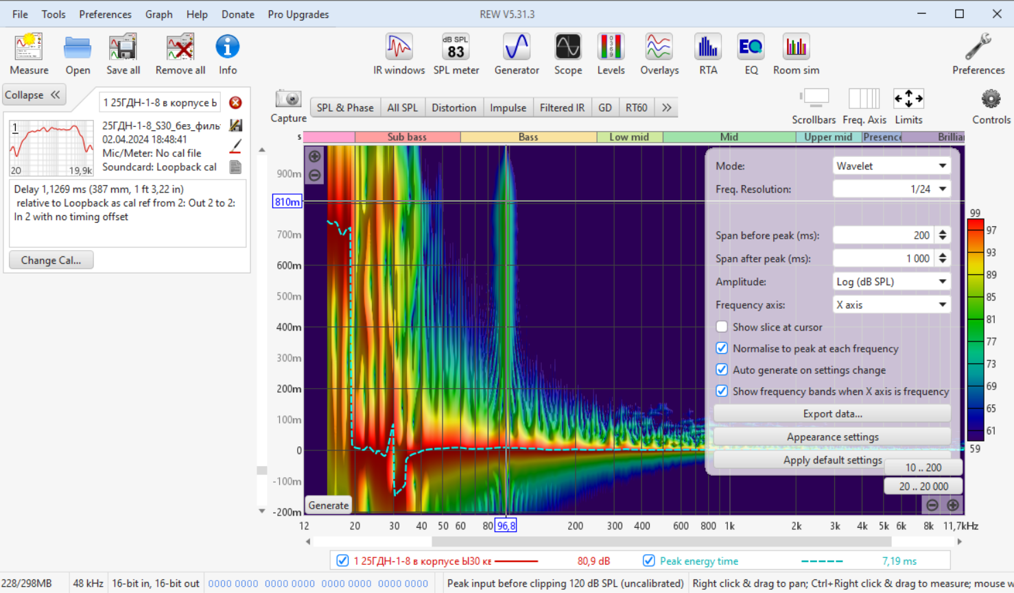 Резонанс динамика в ящике отчётливо виден на спектрограмме и в данном случае составляет 97Гц. А то что он такой длинный во времени, означает лишь то, что это время свободных колебаний нужно таки уменьшать....