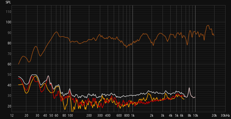 Импеданс в печали. Оранжевым - просадка от 20 Ом в параллель НЧ динамику. Вытянули фильтром чуйку СЧ динамику до 94дБ, в 2 с лишним раза убив импеданс, потом - круто посадили отдачу назад до 83дБ гасилкой и делителем (((