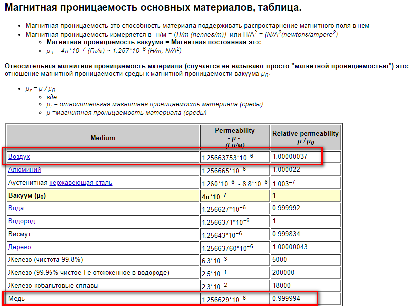 напуганный ютубовскими страшилками про упирающуюся медь в зазоре, полностью игнорирующий тот факт, что медного провода по сравнению с каркасом в 50-100раз больше, посмотрел в таблицу магнитной проницаимости и задумался. Что теперь делать с воздухом в зазоре, как-то откачивать?