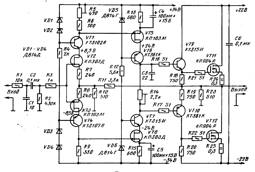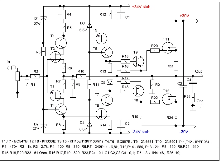 Это схема не моя, я её взял с журнала Радио. Был заказ начинающих музыкантов собрать им усь с квази-выхлопом на дубовых N-канальных мосфетах. Вот и остановился на этой схеме.