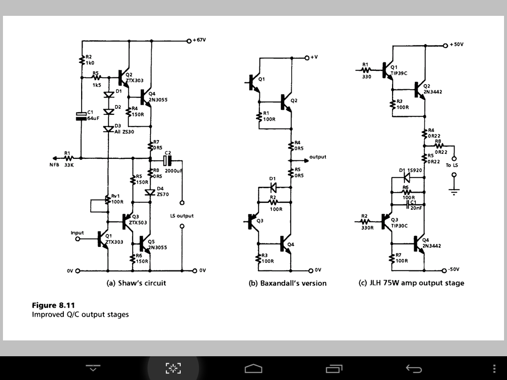 Обидва, і Shaw, і Baxandall намагались зробити квазикомпліментарний каскад більш лінійним. Для цього вони намагались схему симетрувати, додавши "зайвий" pn перехід, зміщений в прямому напрямку, який би імітував відсутній транзистор. У Shaw вийшло краще, з огляду на імітацію базо-емітерного переходу вихідного транзистору, що дозволило отримати трохи вищу лінійність передавальної характеристики каскаду, але, як вже вище згадували, таке розміщення додаткового діода призвело до асиметрії обмеження напруги сигналу на виході. Тому спільнота вибрала варіант запропонований Baxandallом, як менше зло за сукупністю ознак.