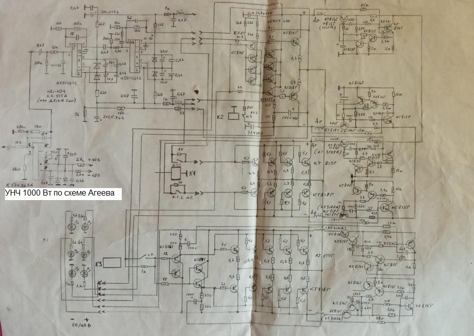 Самое сложное было придумать как переключать, по мере роста сигнала, подключение дополнительных ВК при одновременном изменении питающего напряжения на них (выходных усилителей тока как бы три группы, первая работает условно до 20 Вт, вторая - до 100-150 Вт, третья свыше этого уровня) - горели транзисторы, выкидывал горстями 818(9), 815(4). Да, еще там есть всроенный преобразователь 12 В в 220В на том же трансе, примерно на 1,5 кВт, все на тех же 818, на схеме не показан._da