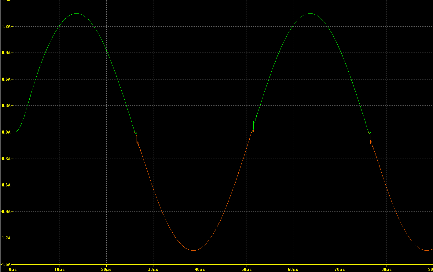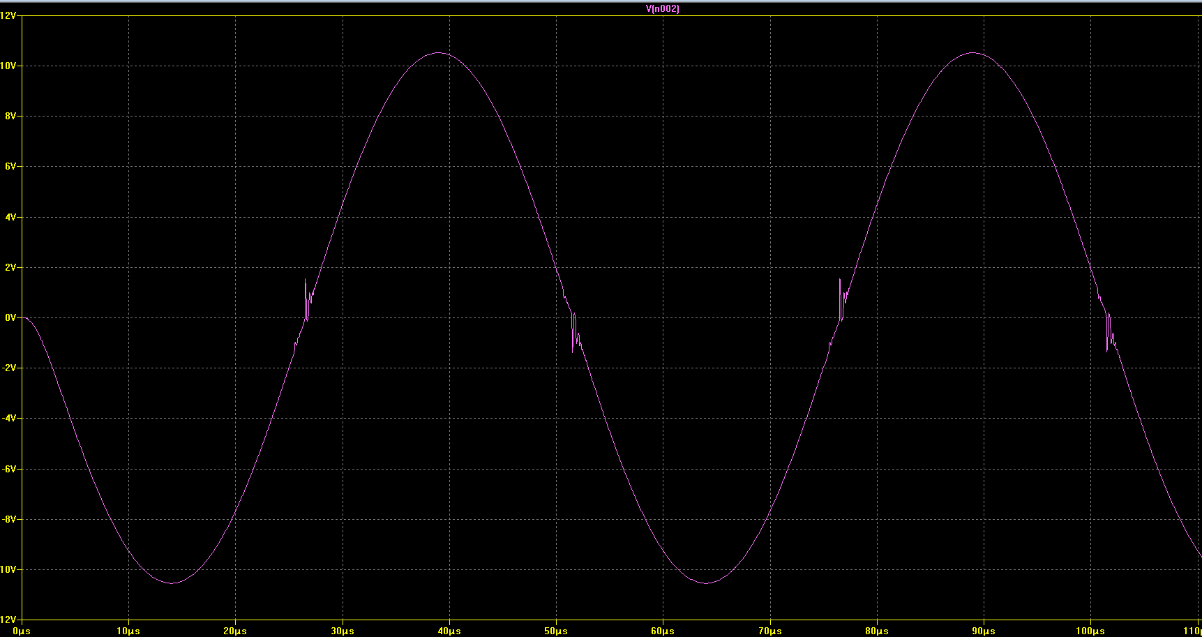 Кстати на верхней картинке есть ступенька. Вы масштаб графика синуса вблизи нуля увеличьте и развертку измените, чтобы скорость роста наклона синуса возросла и была почти вертикальной. Увидите более явно ступеньку в виде искривления в месте стыковки отрицательной и положительных полуволн у синуса.