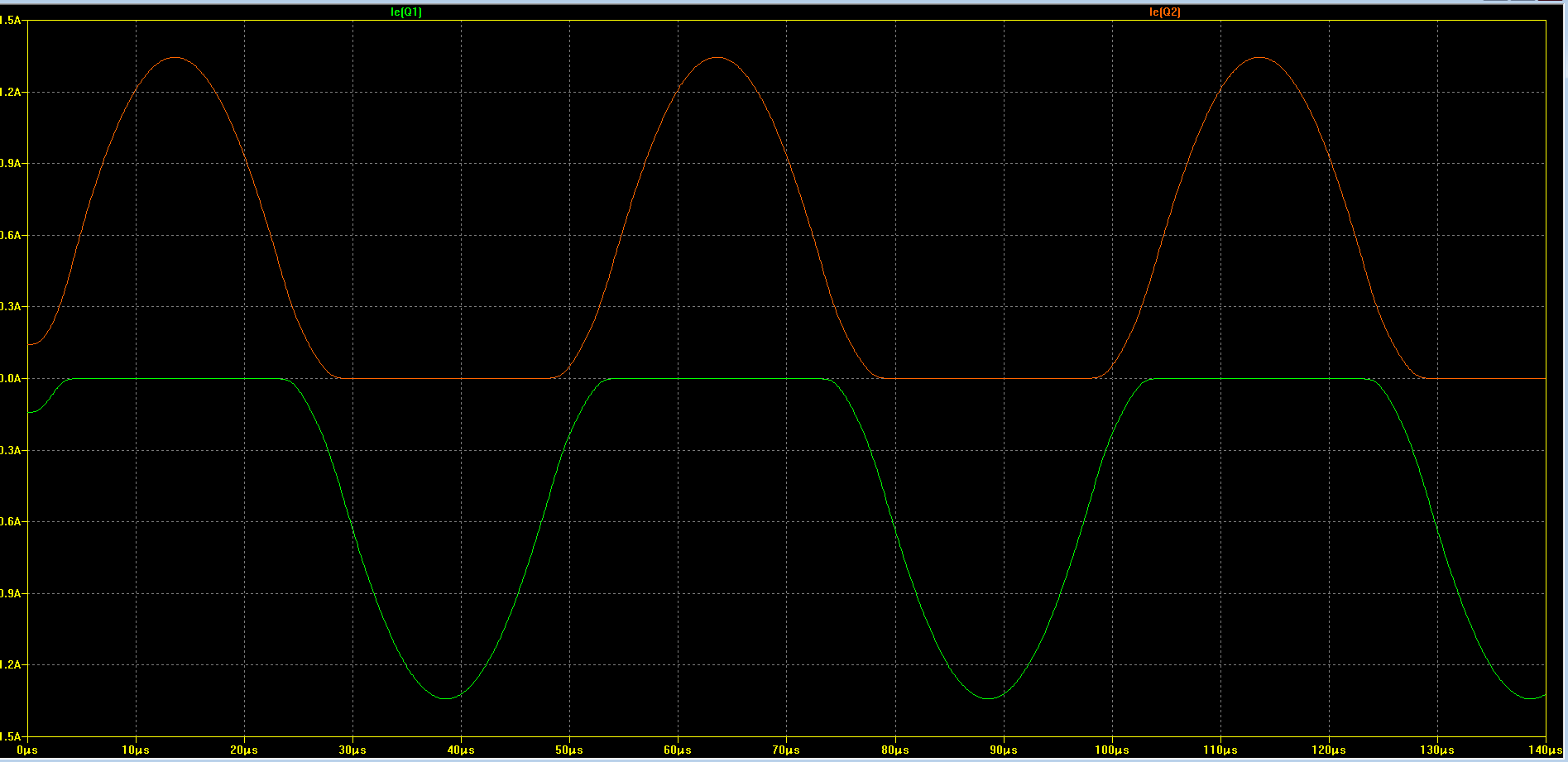 Вот , ток покоя нижнего транзистора 1.5мА , верхний - заперт(из за перекоса постоянки на выходе не ноль)