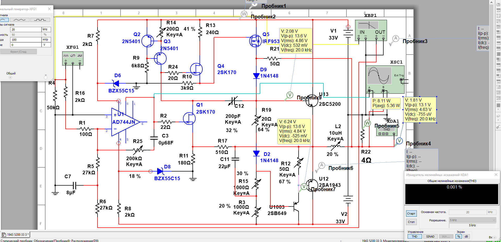 какое у тебя сопротивление нагрузки оу, ответьВот схема что я обещал 0.000007 % на 20 кгц 40 ватт 8 ом Посмотреть вложение 134656