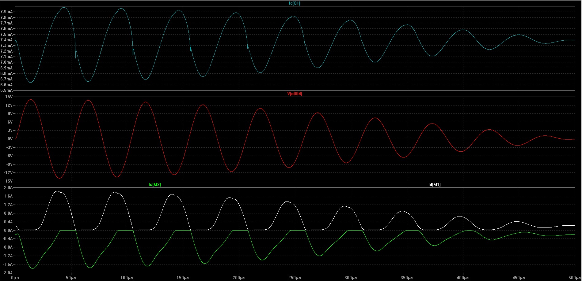 Что мы зрим? Верхняя осциллограмма- ток одного из транзисторов УН.
