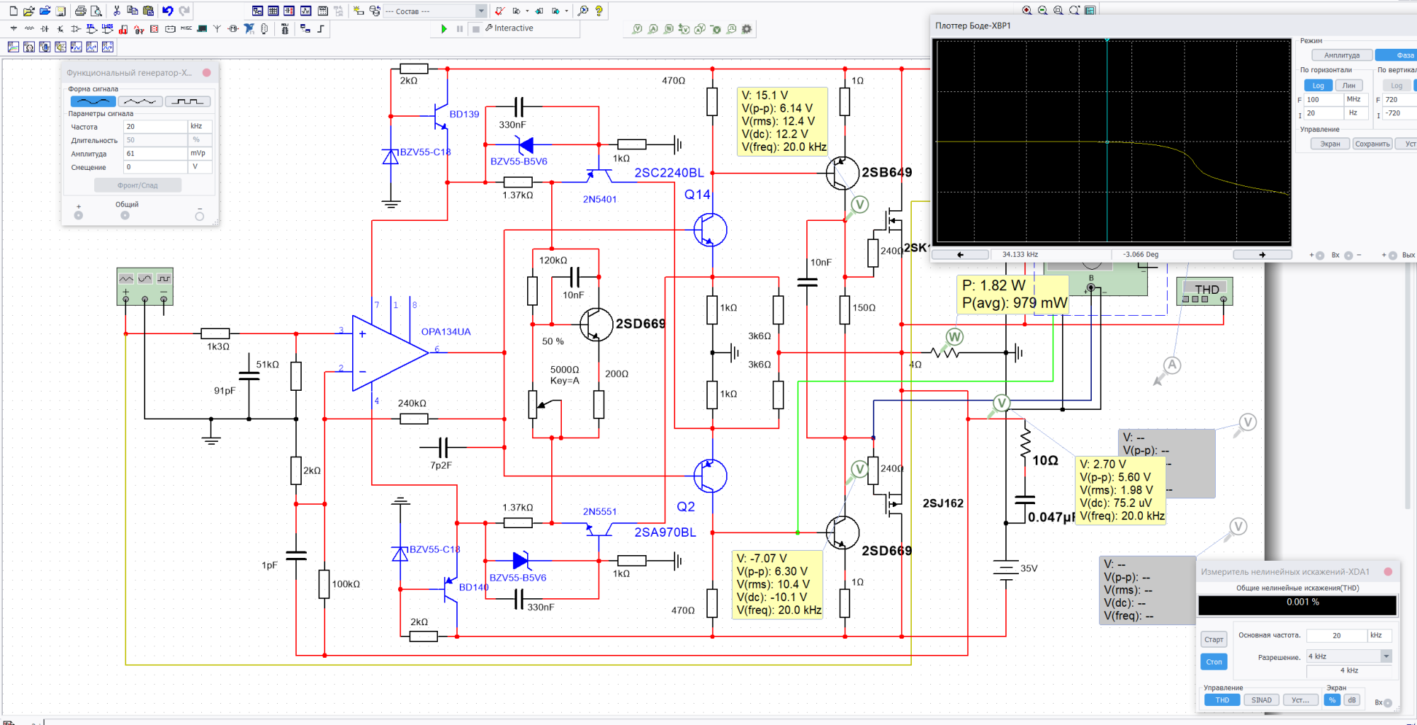 Кг 0.020% на 20К, большего из него не выжмешь (разгружать ВК полевыми). Точнее, не так до 5Вт - 0.003, выше и до предклиппа на порядок вырастут. Х.З., что там "проваливает" (ВАХи и режимы считать ручками)