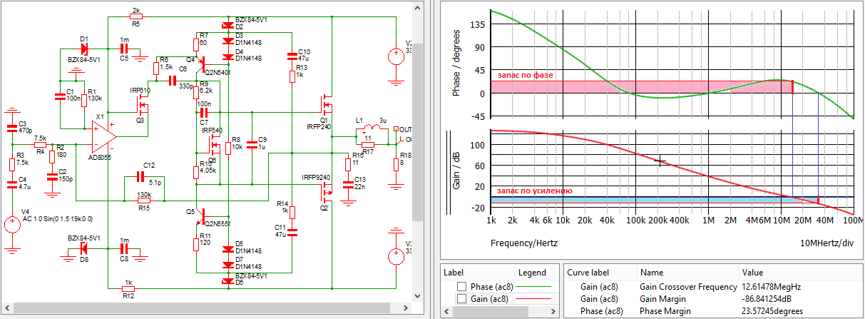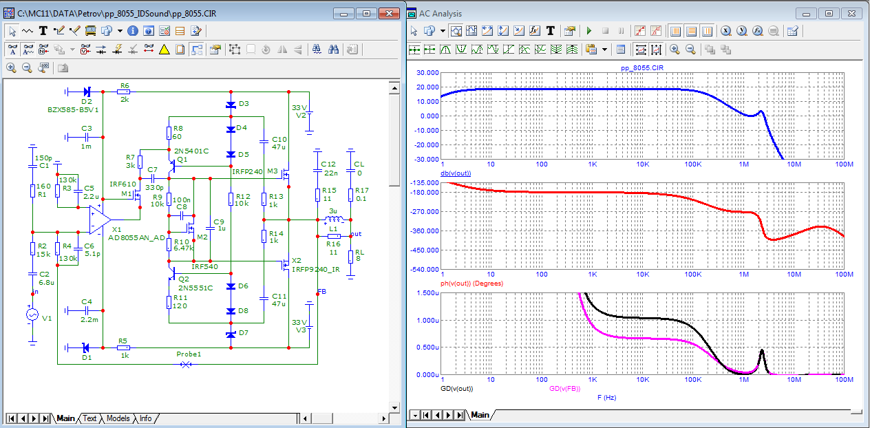 нашел транзисторы Q2N5401, Q2N5551 остальное все из штатной библиотеки. Непонятно что за модель ОУ AD8055, может из-за нее различие.