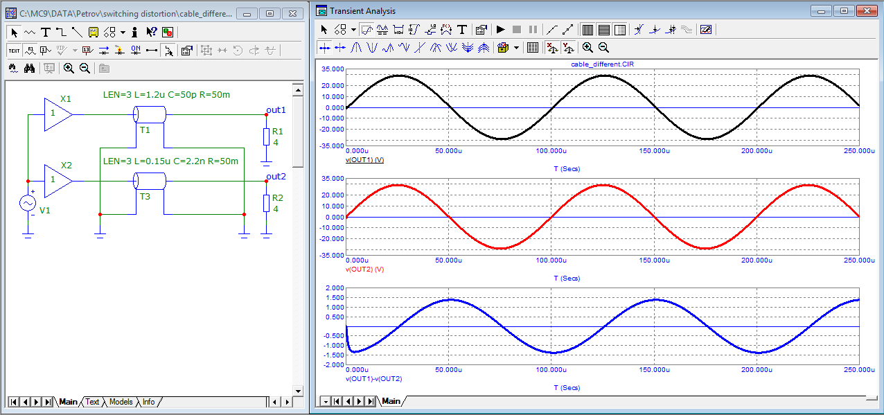 проделал примерно ту же операцию что и звукооператор, произвел вычитание между двумя напряжениями. В результате на выходе получилось напряжение амплитудой 1,5 В при входных по 30 В (пик). Поэтому не удивительно что эта разница была прекрасно слышна.
