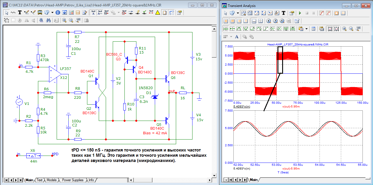 Для сравнения работа усилителя с более скромными параметрами, с двумя нулями...