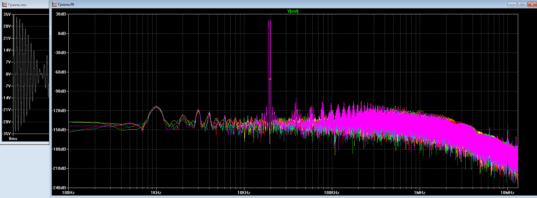 Подадим Граалю на вход куда более суровый сигнал. 300+301кГц номинального уровня. Чтобы господин Петров не возникал- я снял и спектр, это значит что усилитель испытание прошел и рассчёт был закончен. Крупно, чтобы даже слепой видел. Да, для Грааля режим тяжеловат- это всё таки не Мастер, и даже не Данс Макабр, и всё же. Покажь Петров как твой гитарник и с какими искажениями- усилит.