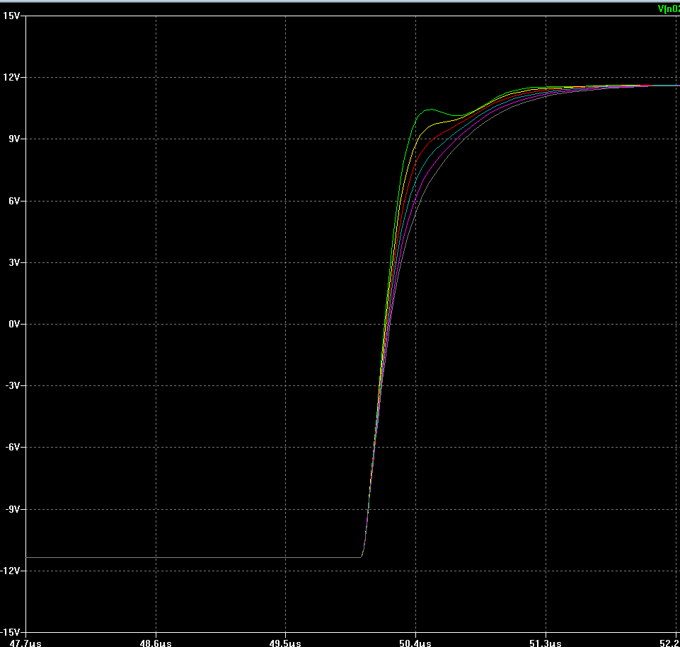 Выходит что при 10 и 11пФ усилитель не слишком устойчив, даром что "задержки" минимальны, три последних ёмкости- уже достаточно хорошо подходят, тут автору выбирать, или собирающему подбирать.