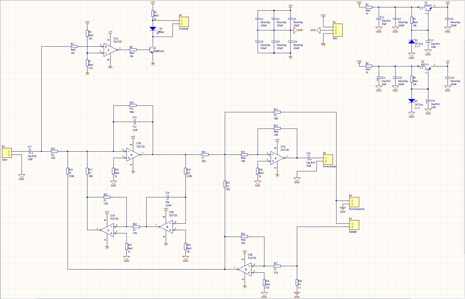 Основываясь на измерениях драйвера и теории управления, я решил установить параметры контура MFB для ровной частотной характеристики в диапазоне от 20 Гц до 400 Гц и реализовал схему защиты звуковой катушки от температуры в реальном времени, чтобы поддерживать температуру звуковой катушки ниже 125 ° C во время работы с перенапряжением. Я также разработал схему контроля перегрузки, которая определяет выходное напряжение усилителя и включает красный свет при приближении к шинам питания.