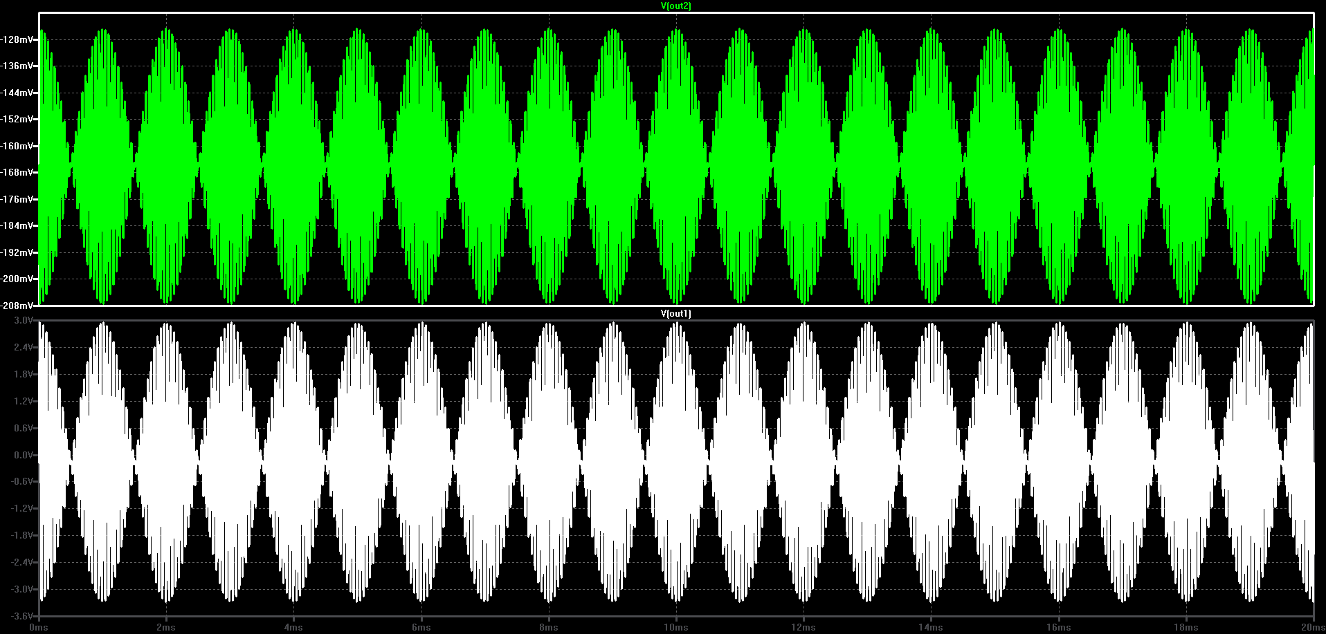 На одном выходе схемы - 3 В ампл, на другом - 40 мВ.