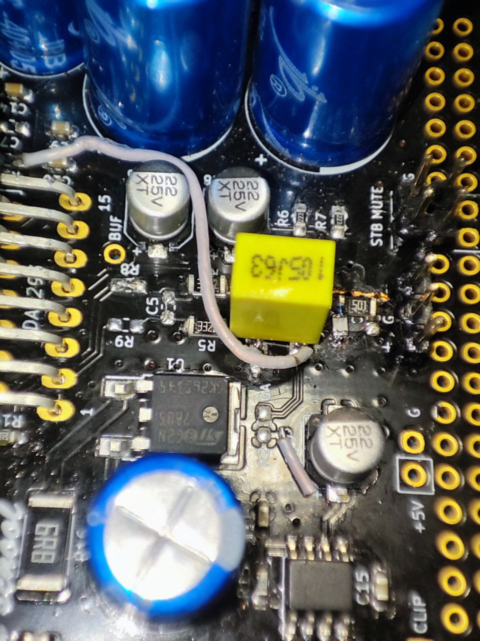 Несмотря на снижение входного сопротивления, вместо электролитического 10 мкф (по схеме) установил (в инвертирующем включении) на входе платы плёночный конденсатор 4,7 мкф. Низов вполне достаточно.