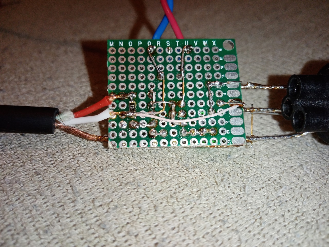 Спаял инвертирующую схему, сразу оба канала R1 10 Ω, R2 223 Ω. Шумит белым шумом на уровне немой канавки, многовато, играет отлично, треска почти не слышно, возможно микросхемы перемаркированые. Сделано на куске стеклотекстолита фольгированного, можно легким движением паяльника превратить в неинверт, резисторы те же.