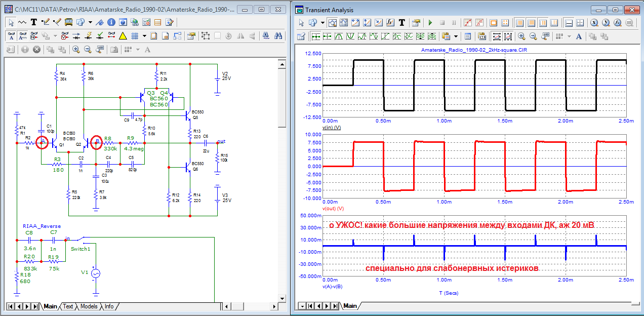 Диффнапряжение: 16 вольт размаха, что в 160 раз больше обещанных Петровым 100 мВ. Входной дифкаскад мертвее Буриданова осла: эмиттерные переходы пробиты обратным напряжением.
